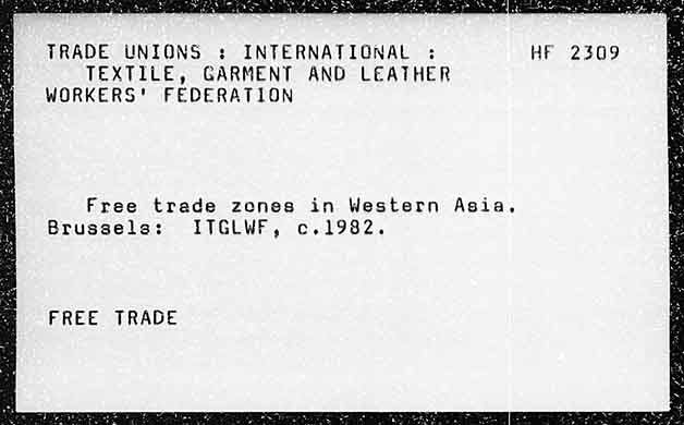 TRADE UNIONS : INTERNATIONAL ;: TEXTILE, GARMENT AND LEATHER WORKERS' FEDERATION Free trade zenes in Western Asia, Brussels: ITGLWF, c.1982. FREE TRADE