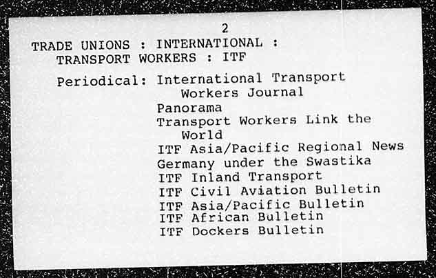 2 TRADE UNIONS : INTERNATIONAL : TRANSPORT WORKERS : ITF Periodical: International Transport Workers Journal Panorama Transport Workers Link the World ITF Asia/Pacific Regional News Germany under the Swastika ITF ITF ITF ITF ITF Inland Transport Civil Aviation Bulletin Asia/Pacific Bulletin African Bulletin Dockers Bulletin