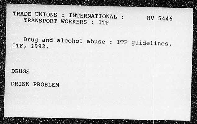 TRADE UNIONS : INTERNATIONAL ;: HV 5446 TRANSPORT WORKERS : ITF Drug and alcohol abuse : I7F guidelines, ITF, 1992, DRUGS DRINK PROBLEM