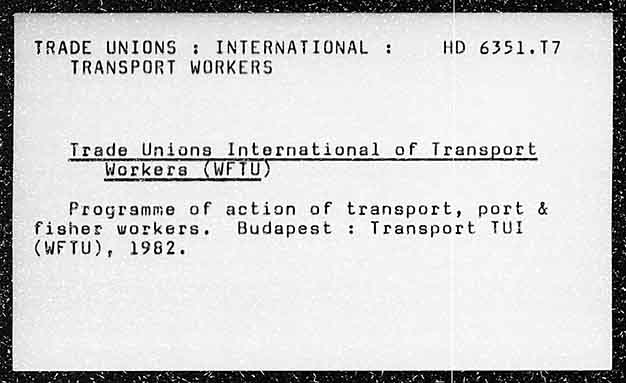 TRADE UNIONS : INTERNATIONAL HD 6351.17 TRANSPORT WORKERS Trade Unions International of Transport Workers (WFIU) Programme of action of transport, port fisner workers. Budapest : Transport JU! (WFTU), 1982.