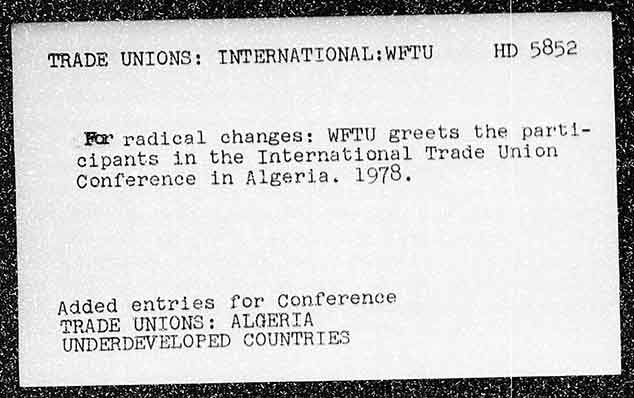 TRADE UNIONS: INTERNATIONAL: WETU HD 5852 For radical changes: WFTU greets the parti- eipants in the Tnternational Trade Union Conference in Algeria. 1978. Added entries for conference TRADE UNIONS: ALGERTA UNDERDEVELOPED © UNTRIES