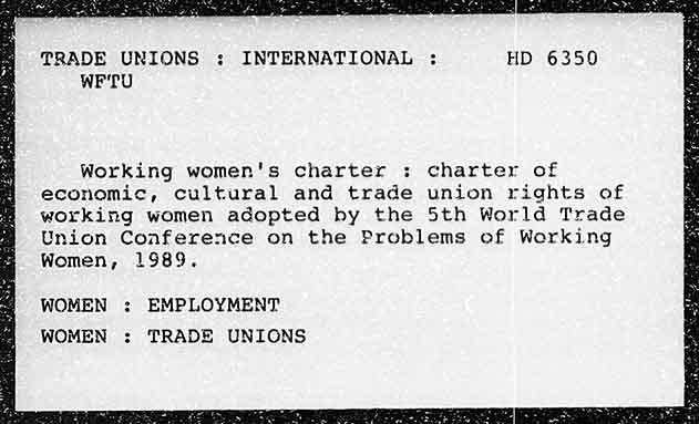 TRADE UNIONS : INTERNATIONAL HD 6350 WFTU Working women's charter ;: charter of economic, cultural and trade union rights of working women adopted by the 5th World Trade Union Conference on the Preblems of Working Women, 1989. WOMEN : EMPLOYMENT WOMEN : TRADE UNIONS