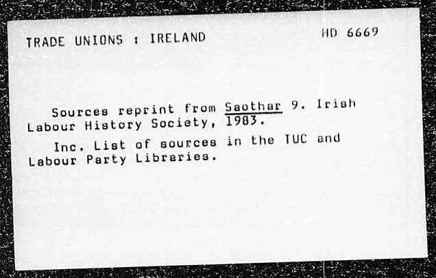 TRADE UNIONS : IRELAND Sources reprint from Labour History Society, Inc. List of sources Labour Party Libreries. WD 6669 Saothar 9. Irish 1983. in the TUC and
