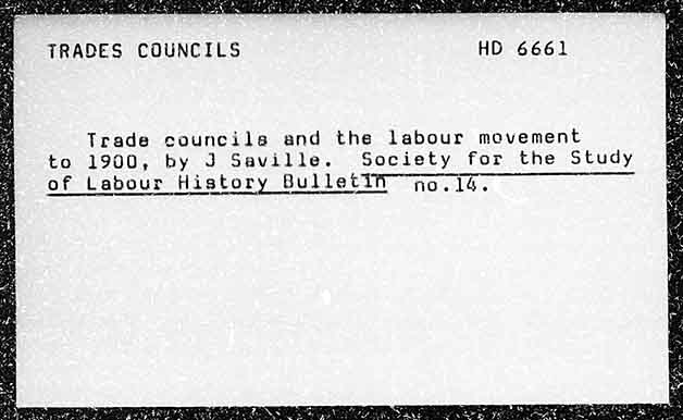 TRADES COUNCILS Trade councils and the Labour movement to 1900, by J Saville. Society for the Study of Labour History Bulletin” fo. 14.