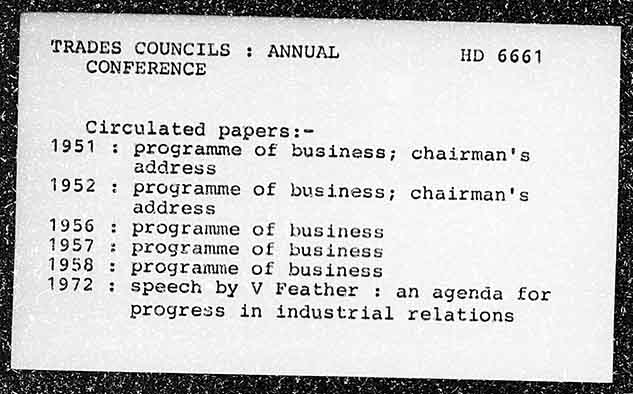 TRADES COUNCILS : ANNUAL HD 6661 CONFERENCE Circulated papers:= 1951 s programme of business; chairman's address 1952 programme of business; chairman's address programme of business programme of business programme of business speech by V Feather : an agenda for progress in industrial relations 1956 ROS 1958 A972