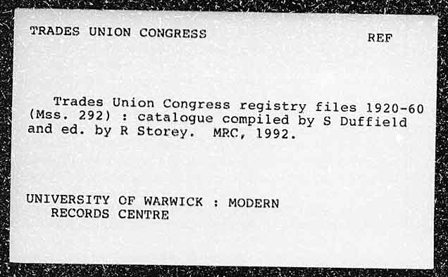 TRADES UNION CONGRESS Trades Union Congress registry files 1920-60 (Mss. 292) : catalogue compiled by S Duffield and ed. by R Storey. MRC, 1992. UNIVERSITY CF WARWICK : MODERN RECORDS CENTRE