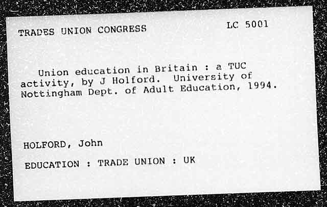 TRADES UNION CONGRESS Lc 5001 Union education in Britain : a TUC activity, by J Holford. University of Nottingham Dept. of Adult Education, 1994. HOLFORD, John EDUCATION : TRADE UNION : UK