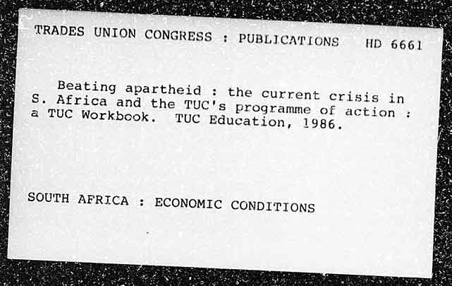 TRADES UNION CONGRESS ; PUBLICATIONS HD 6661 Beating apartheid ; the current crisis in S. Africa and the TUC'S programme of action ; a TUC Workbook. TUC Education, 1986. SOUTH AFRICA ECONOMIC CONDITIONS